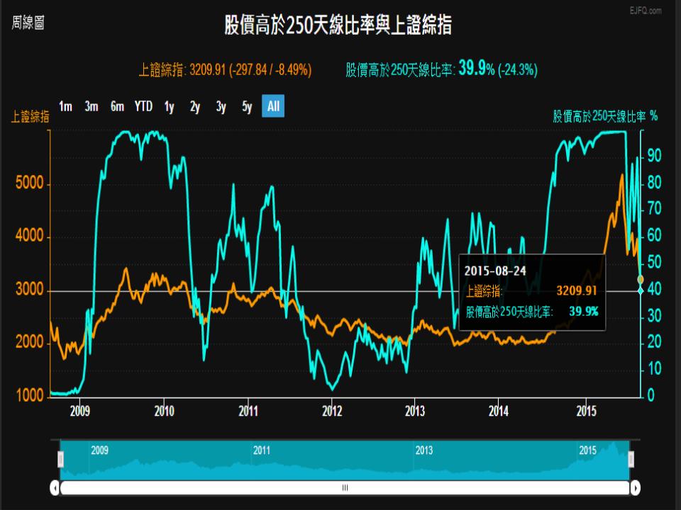 香港股票投資日誌 15年8月24日股價高於250天線比率與上證綜指 09年至今週線圖